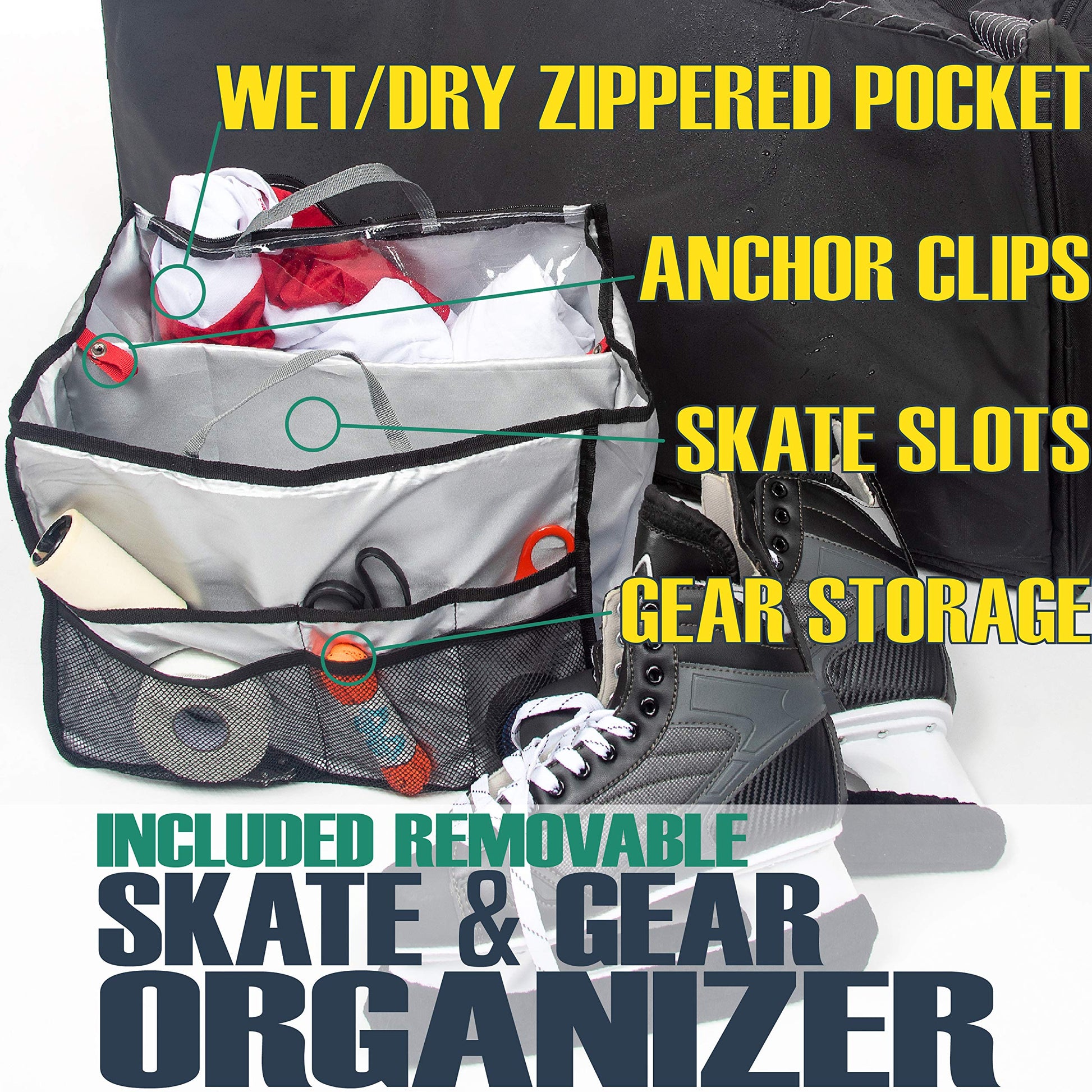 - Skate/gear organizer caddy included - locks in the center or the side of duffle, separates skates on protective felt pad. Includes wet/dry zippered pocket and 6 pockets