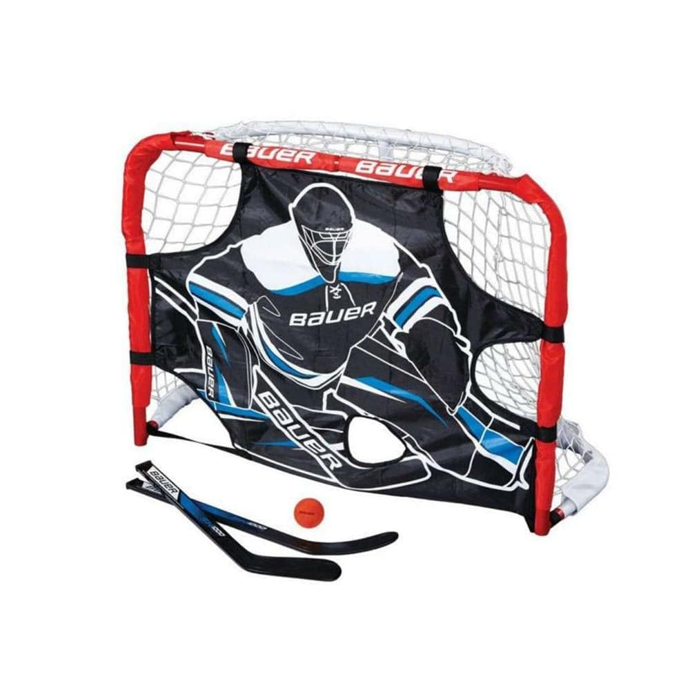 Details: The Bauer Pro Mini Hockey Goal Set comes with one pro-style steel mini goal, two pre-curved mini sticks and one foam ball so you'll have everything you need to play right out of the box. Unlike plastic nets, the 1" steel tubing is significantly more durable and impact resistant, plus Bauer included adhesive foam squares that protect floors from the steel base, and 1 Shooter Tutor to practice shooting on.