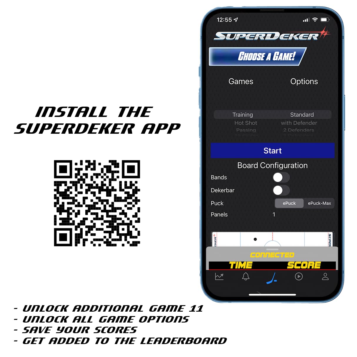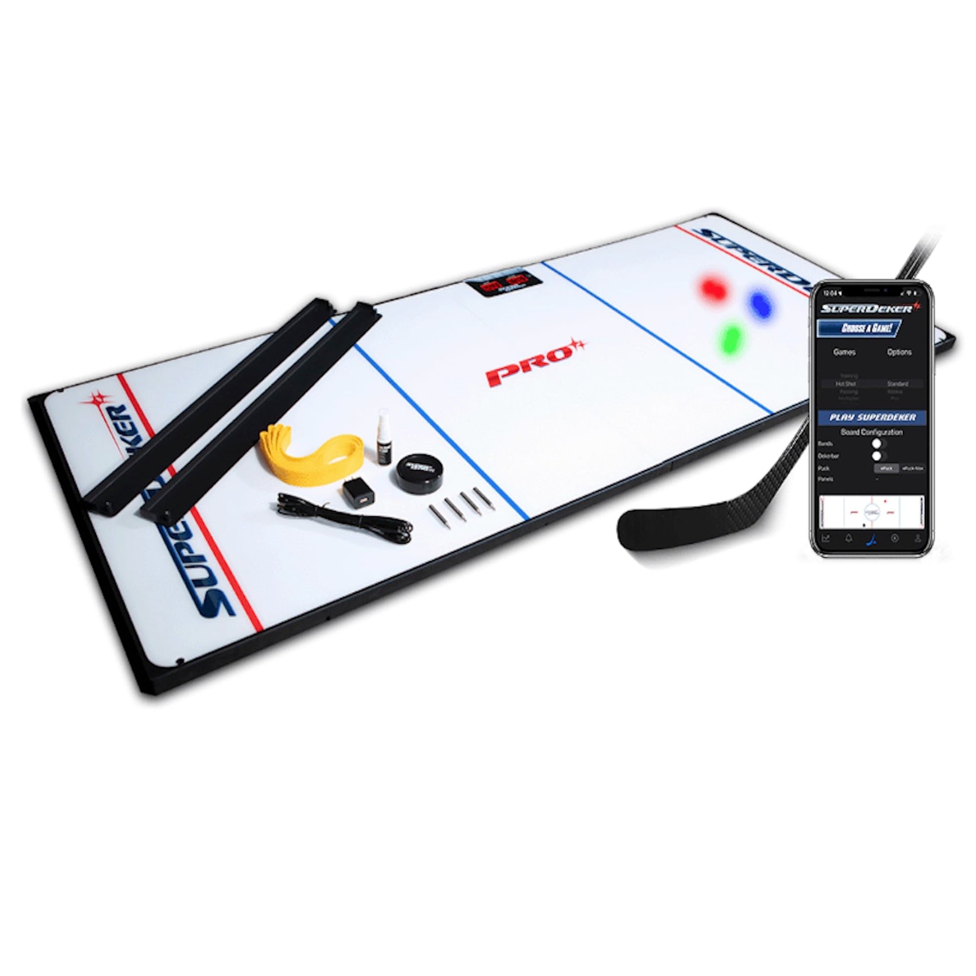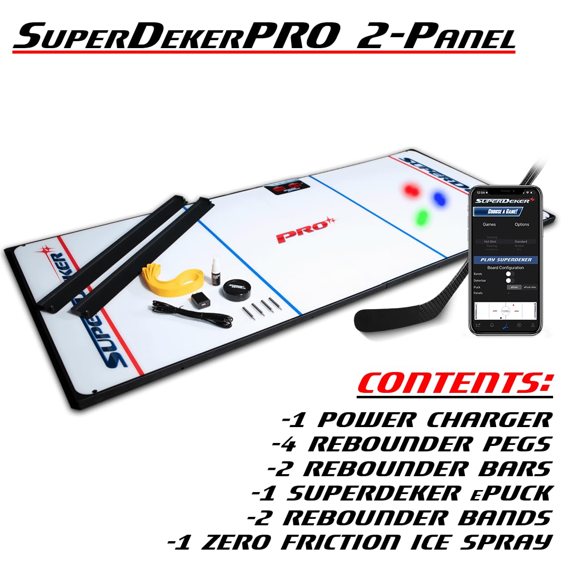 - SuperDekerPRO 2-Panel System: Keep on top of your game with the ultimate bundle from SuperDeker! INCLUDES: SuperDekerPRO (Two Panel), ePuck, 2 Rebounder Bands, Zero Friction Ice-Spray, Power Charger, Power Cable, 4 Rebounder Pegs, 2 Rebounder Bars. SuperDeker App